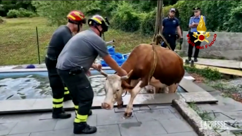 (LaPresse) Intervento per il recupero di una mucca scivolata all’interno della piscina di un’abitazione a Porto Valtravaglia, sulla sponda varesina del Lago Maggiore. Il video mostra i Vigili del fuoco che, dopo aver assicurato l’animale con un sistema di corde e fasce, lo sollevano per riaffidarlo poi alle cure del proprietario.