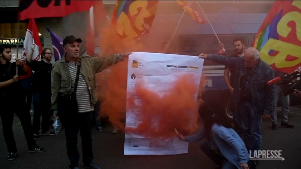 In piazza Cavour a Milano la protesta del sindacato Usb contro l’impennata dei prezzi dell’energia. Davanti alla sede dell’Arera (L’Autorità di Regolazione per Energia Reti e Ambiente) bruciato il fac-simile gigante di una bolletta per “manifestare in modo palese la contrarietà delle politiche dello Stato anche in tema di energia”.