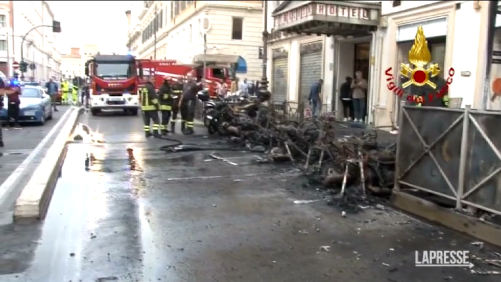 (LaPresse) Spento dai vigili del fuoco l’incendio in via Marsala, che aveva destato allarme per la grande nube di fumo prodotta sopra il centro di Roma. Coinvolti 11 motocicli, annerita ma senza ulteriori danni la facciata dell’edificio adiacente, nessun problema per la vicina Stazione Termini. DISTRIBUTION FREE OF CHARGE – NOT FOR SALE