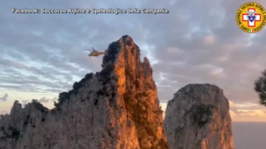 Due scalatori, originari della provincia di Bari, sono rimasti bloccati su una parete del Faraglione di terra a Capri: decisivo l’intervento del Soccorso Alpino e Speleologico della Campania che, tramite un elicottero, ha raggiunto la coppia recuperandola, come mostra il video rilasciato dall’Ente.
