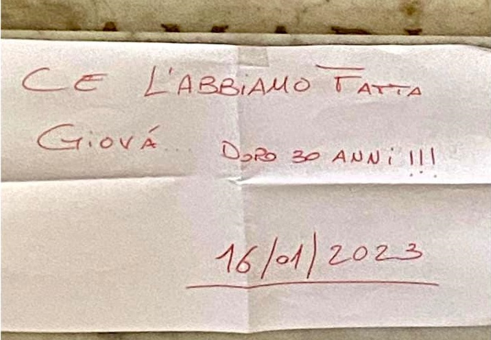 A Palermo, dopo l’arresto di Matteo Messina Denaro, è comparso un bigliettino sulla lapide della tomba di Giovanni Falcone, il giudice ucciso dalla mafia nella strage di Capaci del 1992: “Ce l’abbiamo fatta, Giovà”. Un messaggio che non ha bisogno di spiegazioni e che qualcuno ha voluto lasciare per Falcone, come ad avere la certezza che la notizia arrivasse anche a chi ha pagato con la vita la lotta alla mafia. La foto è stata postata su Facebook dalla Fondazione Falcone.