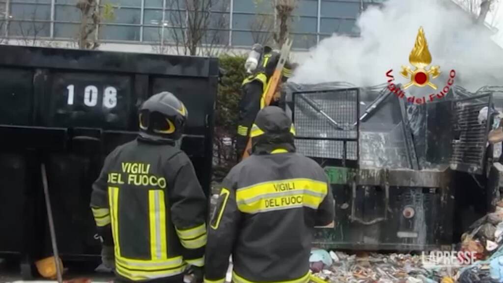 Squadre dei Vigili del fuoco di Rimini impegnate nelle operazioni di spegnimento di un incendio che ha coinvolto un compattatore di rifiuti nella fiera. Le immagini dell’intervento.
