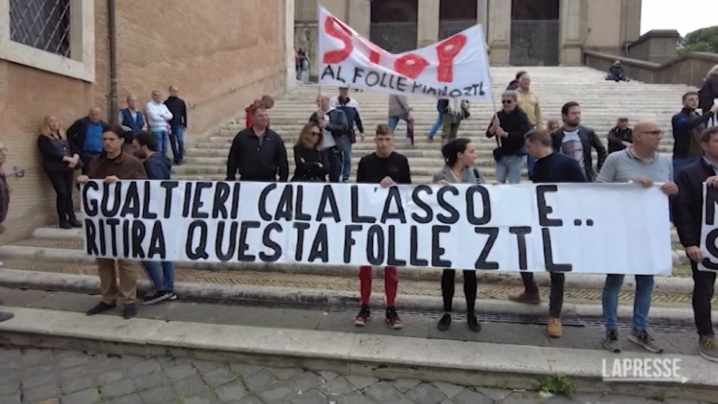 Cittadini in piazza a Roma di fronte alla sede del Comune per protestare contro la “nuova ztl”, la fascia verde che secondo i piani del Campidoglio dovrebbe vietare la circolazione ai veicoli inquinanti in una larga fetta della Capitale. Tra gli organizzatori il Coordinamento Comitati No Ztl e il consigliere leghista Fabrizio Santori. Tra i manifestanti anche alcuni esponenti del nuovo movimento politico dell’ex Forza Nuova Giuliano Castellino.