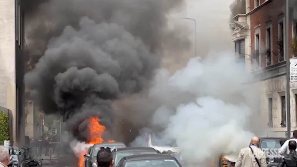 Esplosione in centro a Milano. L’incendio in via Pier Lombardo, zona di porta Romana, innescato forse da un furgone che ha preso fuoco. Coinvolte diverse vetture. Nelle immagini i veicoli in fiamme e l’enorme colonna di fumo nero che si leva in cielo.