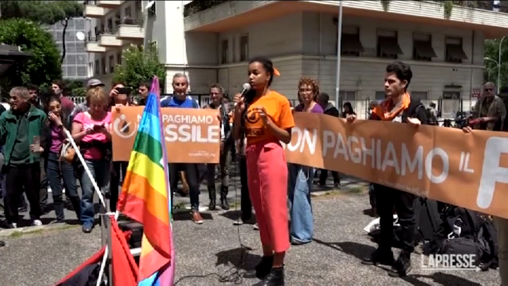 Presidio di Ultima Generazione a Roma davanti alla sede del tribunale in occasione della prima udienza del processo per l’imbrattamento della facciata del Senato, il 2 gennaio scorso. I tre ragazzi rischiano fino a cinque anni di carcere per danneggiamento aggravato. In piazza con i rappresentanti e attivisti dell’associazione ambientalista anche alcuni esponenti politici: il leader di Sinistra Italiana Nicola Fratoianni, il co-portavoce di Europa Verde Angelo Bonelli e la senatrice di AVS Ilaria Cucchi.
