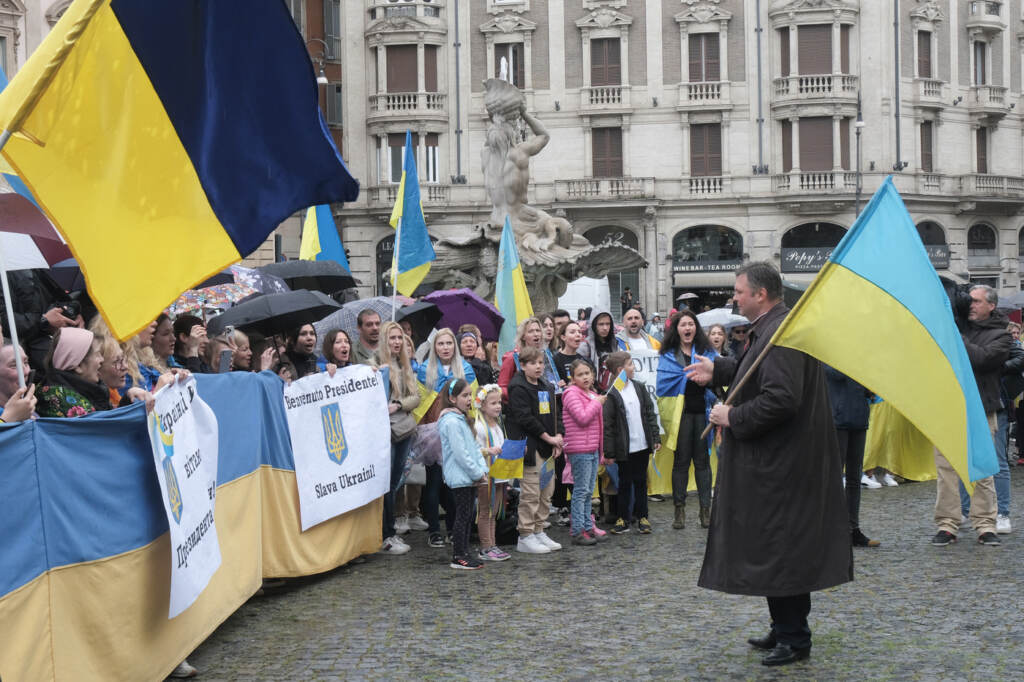 In piazza Barberini alcune decine di persone si danno appuntamento per salutare il presidente Zelensky: cantano ‘Bella ciao’ e la canzone ucraina ‘Viburno rosso’. Intonano cori di benvenuto per il presidente e altri cori contro Mosca: “Assassini russi, fuori dall’Ucraina”. “Siamo in guerra perché non abbiamo alternativa e questa guerra finirà, ma la pace deve essere giusta”, dice Oles Horodetskyy, presidente della Associazione Cristiani Ucraini in Italia e promotore della manifestazione.