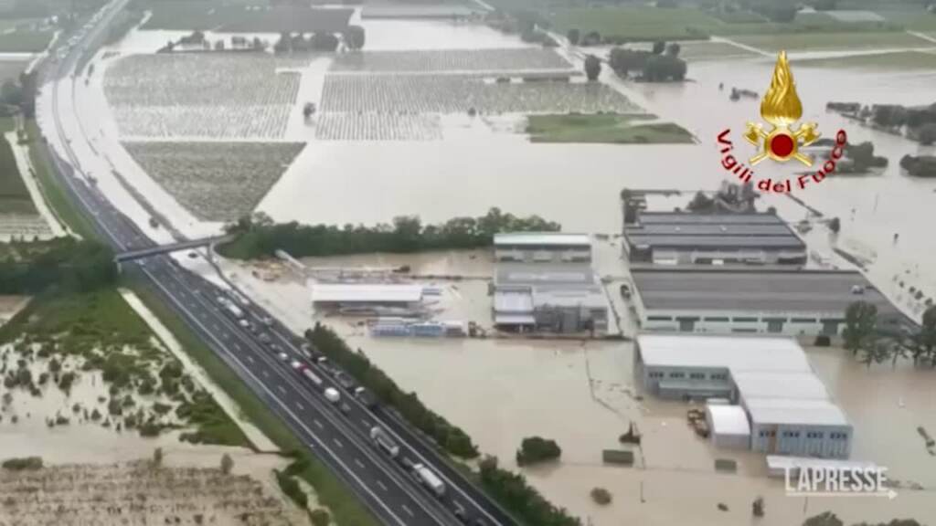 Gravi disagi sulle strade dell’Emilia-Romagna dopo l’ondata di maltempo che da ieri ha colpito la regione, provocando almeno cinque morti e diversi dispersi. Nelle immagini, riprese dai mezzi aerei dei Vigili del Fuoco, si vedono dall’alto gli allagamenti sull’autostrada A14 Adriatica.