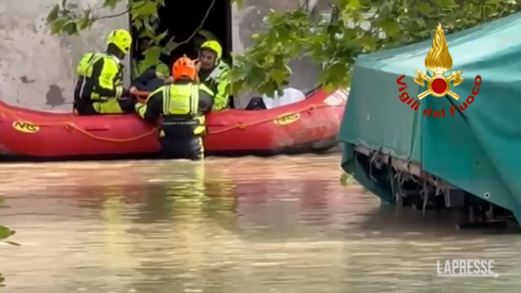 Continua senza sosta il lavoro degli uomini delle forze dell’ordine, impegnati a soccorrere le persone bloccate nelle aree allagate della Romagna. Nelle immagini il salvataggio, a bordo di gommoni, compiuti a Villa San Martino Lugo di Romagna e Faenza. Una squadra dei vigili del fuoco del comando di Torino è stata impegnata giovedì mattina nel soccorso di due donne bloccate nella propria casa circondata dall’acqua. I soccorritori hanno trasportato una signora con una barella flessibile attraverso il vano scala, per poi caricarla sul gommone. La donna aveva un urgente bisogno di sottoporsi a un trattamento di dialisi. Una volta raggiunta una zona sicura, è stata consegnata all’equipe del soccorso sanitario per ricevere le cure necessarie.