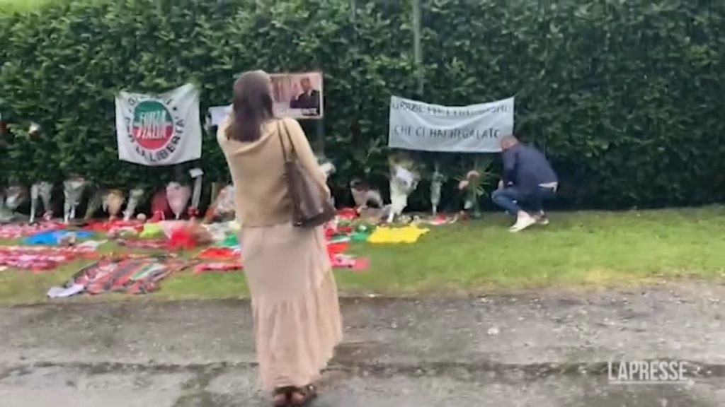 Diluvia a Arcore e fuori da Villa San Martino, la residenza di Silvio Berlusconi, morto ieri a 86 anni all’ospedale San Raffaele di Milano, ci sono solo troupe tv, fotografi e giornalisti appostati. Poche, per ora, le persone che sfidano la pioggia battente e il freddo per rendere omaggio all’ex premier. Una coppia ha deposto un mazzo di fiori davanti alla villa. Un fiumiciattolo di acqua piovana ha inzuppato il prato davanti al cancello della villa dove ci sono sciarpe del Milan e del Monza, striscioni e bandiere delle due squadre e di Forza Italia.