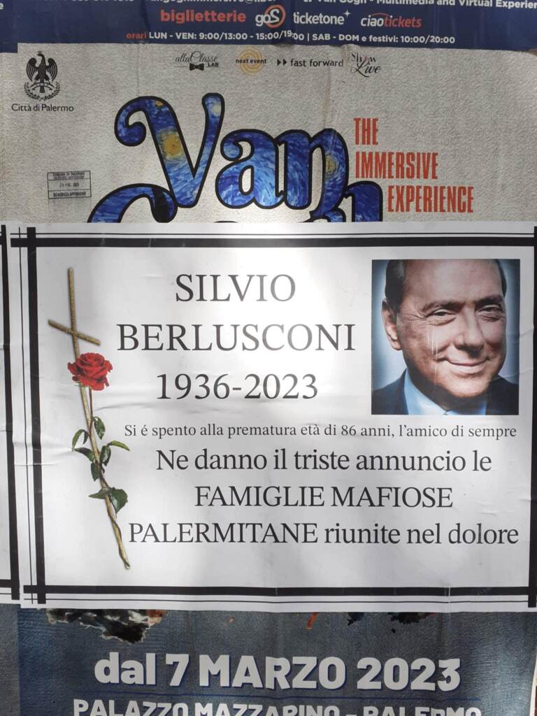 Finti manifesti funebri di Silvio Berlusconi con la frase “Ne danno il triste annuncio le famiglie mafiose palermitane riunite nel dolore” sono apparse stamani a Palermo. I manifesti sono stati affissi nel centro del capoluogo siciliano, nella zona del teatro Massimo. Sul finto necrologio, inoltre, c’è scritto “Si è spento alla prematura età di 86 anni l’amico di sempre”.