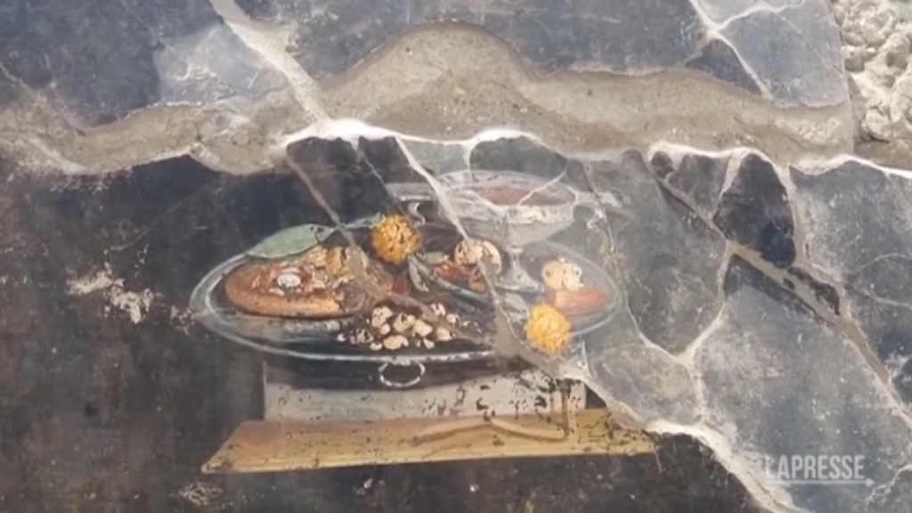 Una antenata della pizza è comparsa dagli scavi di Pompei in un affresco. Un calice di vino, posato su un vassoio in argento con accanto una focaccia di forma piatta e rotonda che funge da supporto per frutti vari, condita con spezie o forse con un tipo di pesto è ciò che gli archeologi del parco Archeologico di Pompei hanno rinvenuto in un affresco, emerso in questi giorni nell’ambito dei nuovi scavi nell’insula 10 della Regio IX a Pompei.