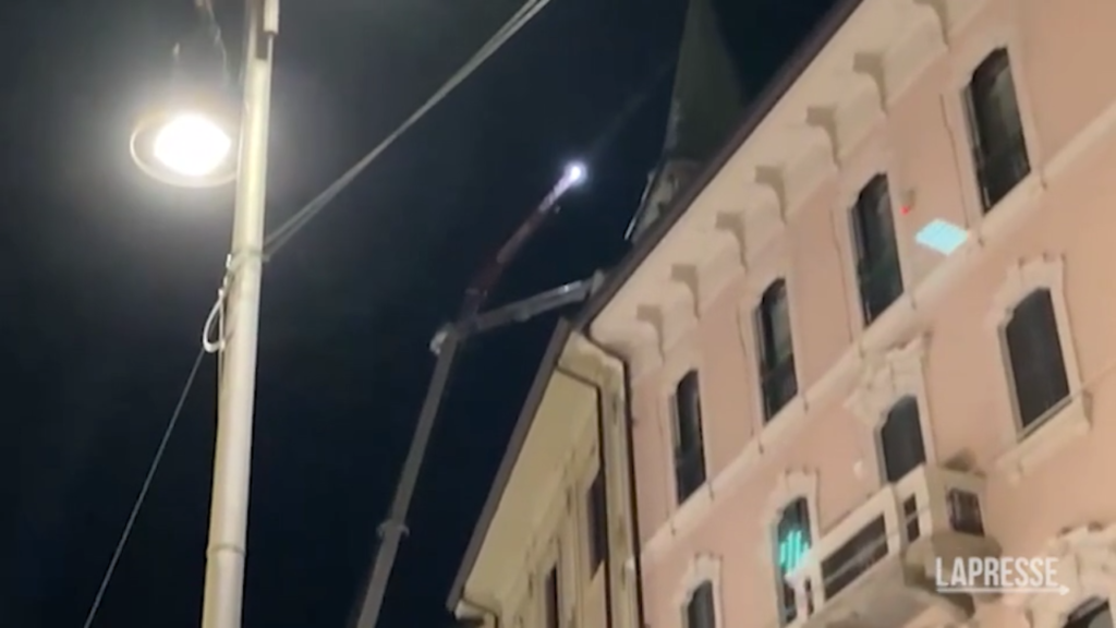 A Milano vigili del fuoco al lavoro in via Torino per la messa in sicurezza del campanile della chiesa di San Giorgio al Palazzo. Il nubifragio della notte tra lunedì e martedì ha staccato il puntale del campanile e in via precauzionale la strada è stata chiusa al traffico.