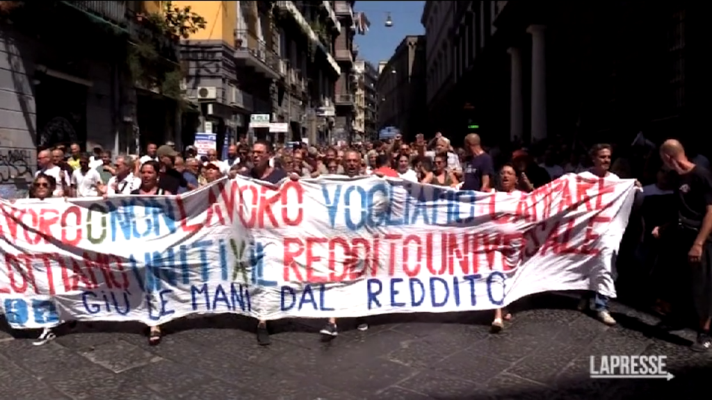 Nuova protesta a Napoli contro l’abolizione del reddito di cittadinanza. Centinaia le persone che sono scese in Piazza del Gesù dando il via a un nuovo corteo. I manifestanti hanno sfilati per le vie centro effettuando anche blocchi stradali nei punti nevralgici di Corso Umberto e via Cristoforo Colombo all’ingresso del porto. “Lanciamo un segnale di rivolta a tutto il paese, chiediamo un lavoro degno e utile. Fino a quel momento ci dovrà essere un reddito garantito e la continuità fino a dicembre. Temiamo che questo governo abbia cancellato il reddito di cittadinanza per incrementare le fila del lavoro nero, affinché la gente sia costretta a vendersi per 700 euro lavorando 12 ore al giorno”, dice uno dei dimostranti.