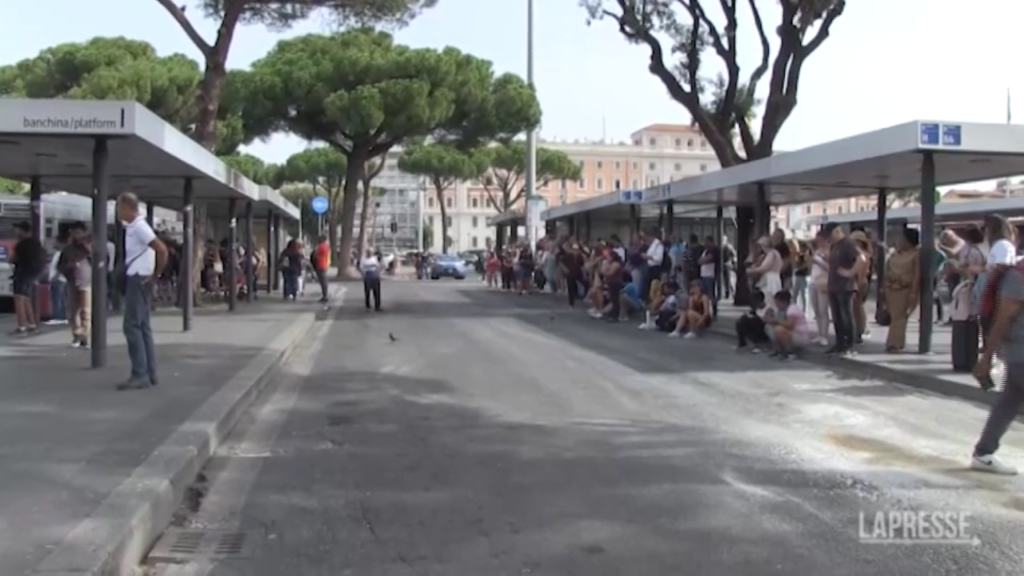 Lunedì nero a Roma a causa dello sciopero nazionale dei trasporti pubblici. Nella Capitale lo stop è iniziato alle 8:30, andrà avanti fino alle 17 e dalle 20 fino a fine servizio. Le immagini mostrano lunghe code di persone, tra cittadini e turisti, che attendono i bus in piazza dei Cinquecento, davanti alla stazione di Termini. Previsti disagi anche nelle altre grandi città. Le sigle sindacali che hanno indetto la protesta chiedono un aumento salariale di 300 euro e la riduzione dell’orario di lavoro a 35 ore settimanali.