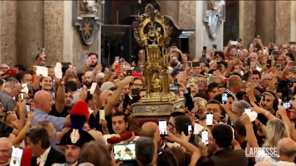 Si è ripetuto il prodigio della liquefazione del sangue di San Gennaro, patrono di Napoli. Alle 10.01, è stata mostrata ai fedeli riuniti in Duomo l’ampolla con il sangue del santo, dopo la processione, aperta dall’arcivescovo monsignor Mimmo Battaglia, dalla cappella dove si trova la teca che custodisce le reliquie del santo fino all’altare maggiore. Sono tre le date in cui si ripete il prodigio: il sabato che precede la prima domenica di maggio, in ricordo della traslazione delle spoglie da Pozzuoli a Napoli, il 19 settembre, giorno in cui ricorre l’anniversario del suo martirio, avvenuto sotto Diocleziano, e infine il 16 dicembre, quando, secondo la tradizione, nel 1631, la statua del santo portata in processione fermò la lava del Vesuvio alle porta della città senza distruggerla.