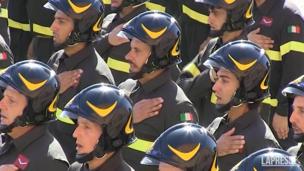 È stata una giornata di festa per gli oltre 600 nuovi vigili del fuoco che hanno prestato giuramento oggi, 12 ottobre, nella sede della scuola di Roma in via Appia. Sotto un sole quasi estivo le nuove “leve” hanno sfilato alla presenza del ministro dell’Interno Matteo Piantedosi e della presidente del Consiglio Giorgia Meloni, che ha pure indossato il casco rosso dei vigili (a favore di telecamere). Una cerimonia che ha visto anche la partecipazione di un numerosissimo pubblico formato da parenti e amici. E alla fine c’è stato anche lo spazio per una proposta di matrimonio per uno degli allievi, festeggiata da tutti i compagni di corso.