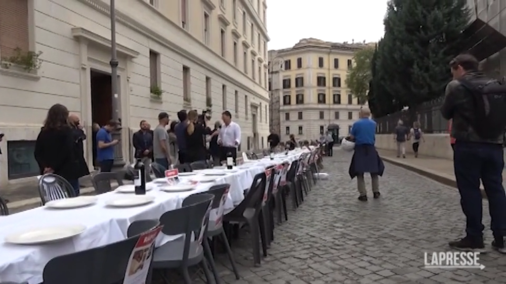 Tavolata simbolica nel quartiere ebraico di Roma per stringersi attorno agli ostaggi israeliani prigionieri di Hamas nella Striscia di Gaza dopo l’attacco del 7 ottobre scorso. Un lungo tavolo vuoto in attesa del loro ritorno con vino kosher, pane tipico dello Shabbat e foto delle persone rapite su ogni posto. “Al tavolo dello Shabbat le famiglie ebraiche si riuniscono per celebrare l’inclusione e la tenerezza del tavolo familiare. Oggi ricordiamo che circa 200 persone sono prigioniere dell’inferno dei bunker di Gaza. Il nostro augurio è che queste famiglie, e ci sono bambini di 9 mesi, possano tornare a riempire questo tavolo e che torni la serenità per tutti”, dice il presidente della Comunità Ebraica di Roma Victor Fadlun. “Ringrazio i ristoratori del Portico d’Ottavia per avere promosso questa iniziativa”, aggiunge il rappresentante della comunità parlando con i cronisti.