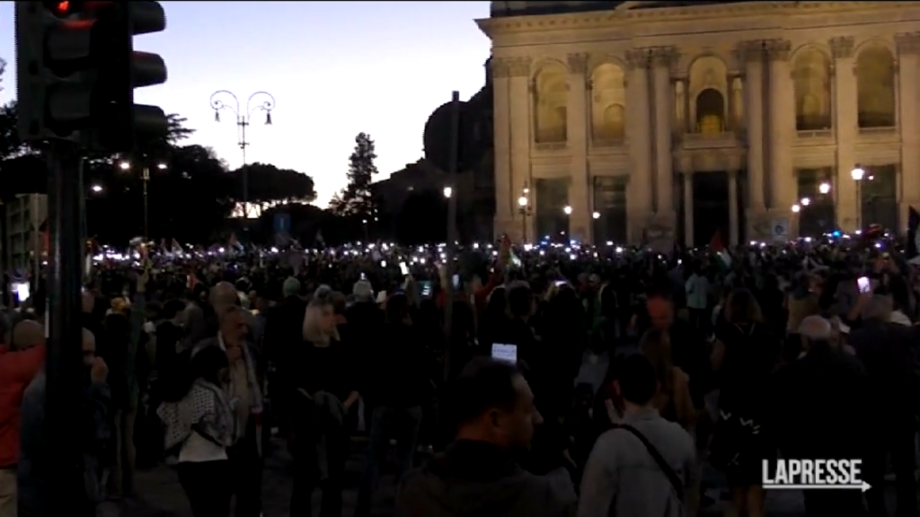 Migliaia di persone hanno partecipato al corteo organizzato sabato 28 ottobre a Roma in solidarietà del popolo palestinese. I manifestanti in seguito si sono radunati in piazza San Giovanni dove al calar del sole hanno acceso le torce dei cellulari, i fumogeni e hanno sventolato la bandiera palestinese.
