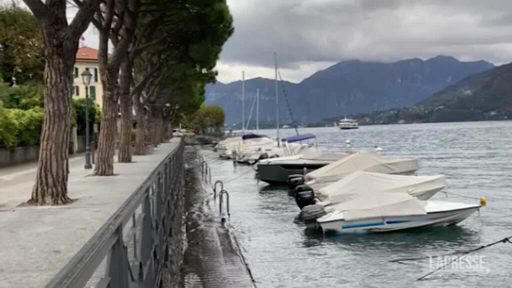Continua a preoccupare la piena del Lago di Como. La pioggia che continua a cadere ha ingrossato ancora di più il Lario con l’acqua che è arrivata a lambire le passerelle dell’attracco delle barche. Nelle immagini il lungo Lago di Lenno, centro abitato della Tremezzina, uno dei paesi più turistici della zona.