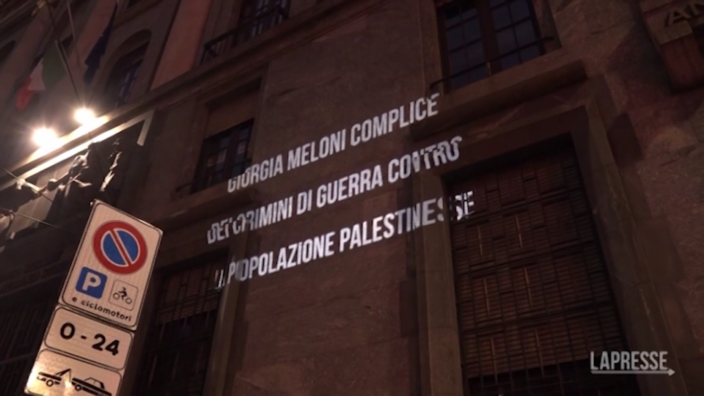 Al termine del corteo pro-Palestina a Milano, i manifestanti hanno proiettato sulla facciata di un palazzo in largo Missori alcune scritte dove, tra le altre cose, si legge: “Giorgia Meloni complice dei crimini di guerra contro la popolazione palestinese”. Sul montaggio, che alterna testo a immagini di incontri della premier col Primo Ministro israeliano Benjamin Netanyahu e col Presidente Americano Biden, si legge ancora: “Israele sta compiendo un genocidio con i soldi delle nostre tasse. Fermiamo la nostra complicità in questo massacro”, seguito da una lista di aziende da boicottare tra cui Mc Donald’s, Starbucks e Leonardo.