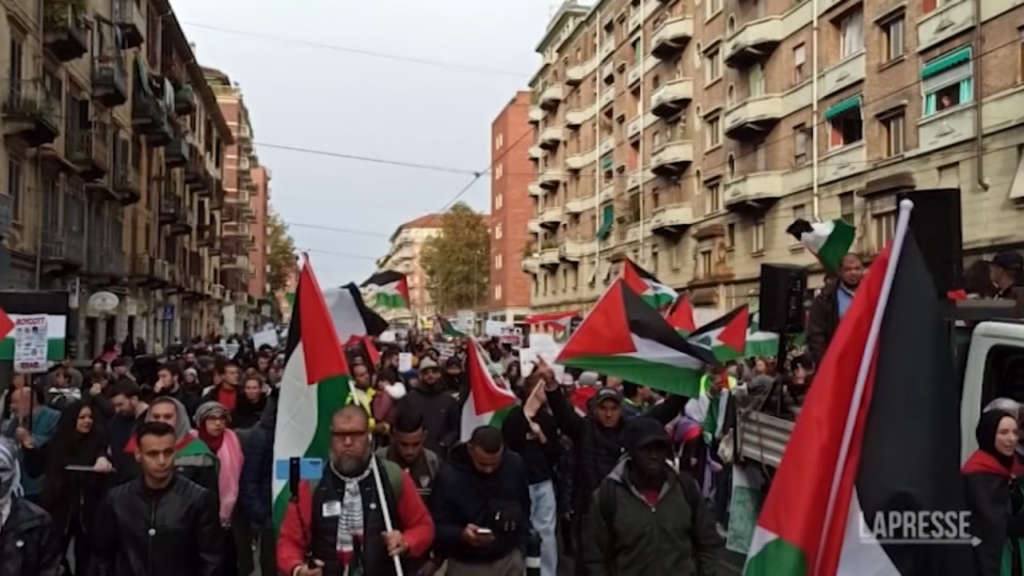 In centinaia in piazza a Torino nel pomeriggio di sabato 4 novembre per un corteo pro-Palestina. I manifestanti hanno sfilato per le vie della città intonando cori come “Free Palestine” e “Israele assassina”, e si sono recati anche davanti alla sede Rai, presidiata da un grosso cordone di polizia, accusando di disinformazione la tv di Stato.