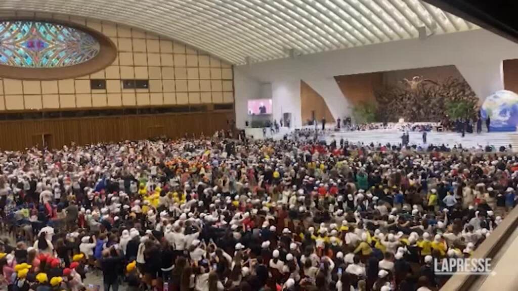 In attesa dell’arrivo di Papa Francesco, sul palco l’artista Mr. Rain ha intonato ‘Supereroi’ accompagnato dal coro di 7mila bambini presenti in Aula Paolo VI, in Vaticano. Il Pontefice, che ha ammesso di non stare bene di salute, oggi ha ricevuto bambini da 84 Paesi nel mondo.