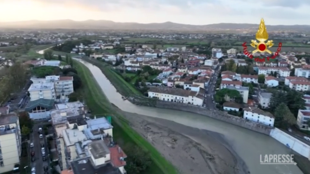 Continuano i lavori dei vigili del fuoco dopo l’emergenza maltempo in Toscana dei giorni scorsi con allagamenti e inondazioni. 5.800 interventi in 5 giorni, 583 vigili del fuoco al lavoro con 110 mezzi. Proseguono le ricerche dei dispersi, le operazioni di prosciugamento e assistenza alla popolazione. Nelle immagini il sorvolo dei droni su Campi Bisenzio, una delle zone più colpite dall’alluvione.
