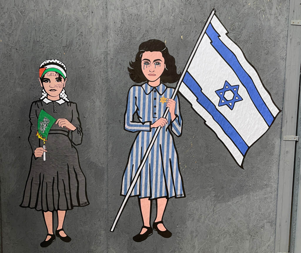 Anna Frank che piange accanto a una bambina di Gaza che brucia la bandiera di Hamas. È il murales apparso a Milano in Piazza Castello dell’artista aleXsandro Palombo: l’opera, che fa parte della serie ‘Innocenza, odio e speranza’ vede Anna Frank con la divisa di Auschwitz e stella di David mentre piange e tiene tra le mani la bandiera d’Israele, al suo fianco c’è una bambina palestinese con la Kefiah in testa e sulla fronte una fascia con la bandiera della Palestina, sul suo volto la scritta Free Gaza, in una mano tiene la bandiera di Hamas e nell’altra una candela con cui gli dà fuoco.