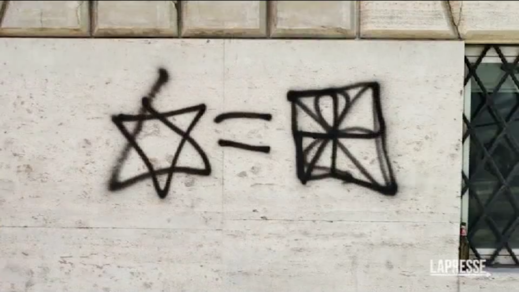 In Piazza delle Cinque Scòle, in pieno quartiere ebraico a Roma, è comparsa una scritta antisemita. Il graffito rappresenta la Stella di David a sei punte equiparata a una svastica. Appena scoperto, il simbolo nazista è stato prontamente coperto con un quadrato per camuffarne il significato, ma la scritta è ancora adesso pienamente visibile sul muro.