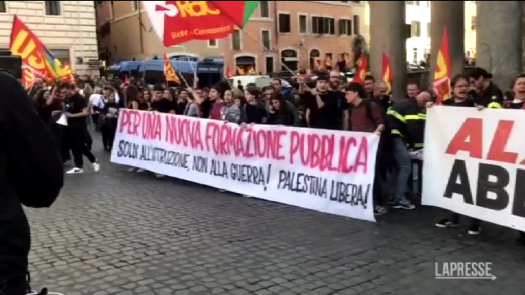 In piazza contro tutti. A Roma il sindacato Usb ha voluto manifestare la propria contrarietà a questo governo e al “massacro palestinese” ma anche ai sindacati confederali (Cgil e Uil) che oggi, 17 novembre, hanno indetto lo sciopero generale. I manifestanti si sono diretti in corteo per le vie del centro verso il Pantheon, controllati a vista dalla polizia. A loro si sono uniti anche gli studenti che si trovavano al ministero dell’Istruzione.