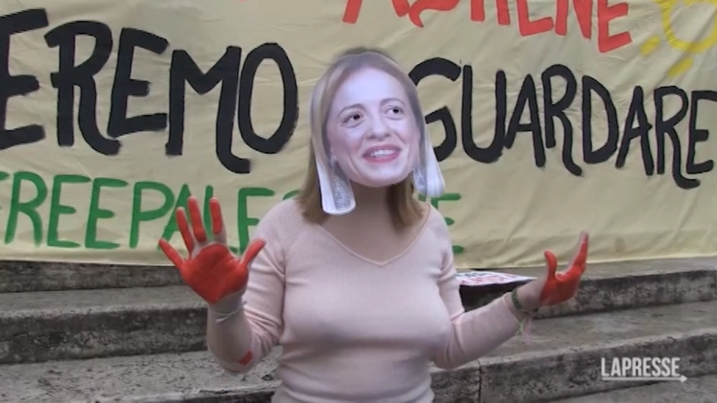 La premier Giorgia Meloni con le mani sporche di sangue e cori a sostegno della Palestina. In occasione della giornata nazionale degli studenti, la Rete degli studenti medi e l’Udu hanno organizzato un flash mob davanti al Ministero dell’Istruzione e del Merito, a Roma, per condannare l’intervento militare israeliano nella Striscia di Gaza.