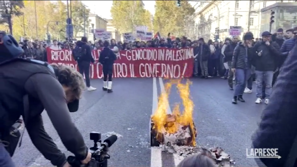 Tensioni tra studenti e polizia durante il corteo che si è svolto a Torino il 17 novembre. In piazza Carlo Felice, i manifestanti hanno tentato di forzare il cordone di sicurezza per raggiungere Piazza Castello deviando però dal percorso autorizzato. I poliziotti hanno risposto con una carica di alleggerimento e anche qualche manganellata. Scanditi cori contro il Governo ed esposto un cartello con le effigi di Benjamin Netanyahu e Giorgia Meloni che si stringono la mano, e una mano rossa di vernice sui volti dei due leader a simboleggiare il sangue che sta scorrendo sulla striscia di Gaza. Gli studenti hanno anche bruciato un cartone che rappresenta il Governo italiano. A fine corteo sotto il palazzo della Regione Piemonte è stata bruciata una bandiera di Israele. Diversi i momenti di tensione con le forze dell’ordine sotto l’ufficio scolastico regionale con lancio di uova, tensioni anche all’inizio di via XX settembre dove è stata lanciata una bottiglia di vetro contro una camionetta.