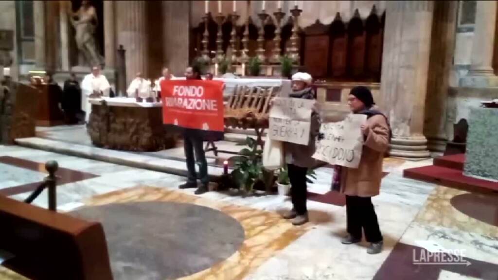 Tre attivisti del movimento per il clima ‘Ultima Generazione‘ hanno preso la parola durante la messa per l’Immacolata Concezione al Pantheon. Dopo il segno della Pace, i tre attivisti si sono messi davanti all’altare con cartelli con scritto ‘soldi per la vita, non alla guerra’ e ‘Fondo Riparazione”. “Siamo dalla stessa parte. Forse siamo meno irrequieti, ma anche noi preghiamo per la pace” ha detto loro Monsignor Angelo Frigerio invitando i tre attivisti a fare una foto insieme, facendoli parlare e tenendoli accanto all’altare durante la comunione e per il resto della messa.