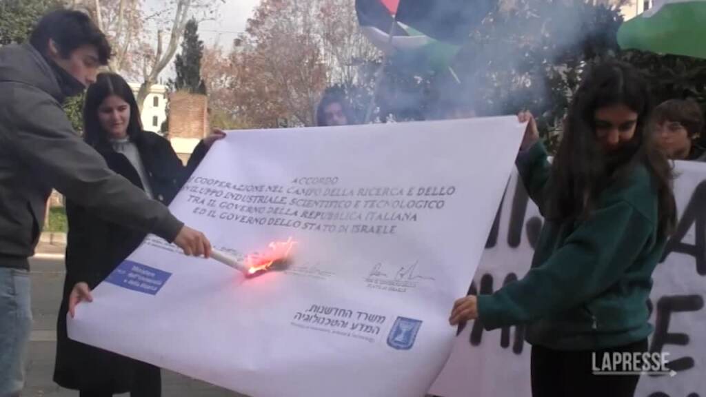 Studenti in piazza a Roma contro l’accordo dell’università La Sapienza con le università israeliane. Il presidio dei manifestanti sotto al Miur. “Il Governo Meloni – accusano gli studenti – , continua a intrattenere numerosi accordi privilegiati con il governo israeliano, e rientra a pieno titolo tra le partnership economico commerciali strategiche sovvenzionando lautamente tramite accordi di cooperazione, fondi e progetti di ricerca l’apartheid, come dimostrato dall’incontro dell’11 luglio scorso – preceduto dalla visita di una delegazioni di rettori italiani in diverse università Israeliane nel dicembre 2022 – tra la Ministra Bernini e il suo omologo Israeliano Ofir Akunis per rilanciare le collaborazioni di ricerca e sviluppo su settori strategici quali l’intelligenza artificiale, la tecnologia quantistica e l’agri-tech”. Nel corso della manifestazione gli studenti hanno poi dato fuoco ad un cartello con sopra riportato i termini dell’accordo stipulato dall’Università La Sapienza con le Università israeliane.