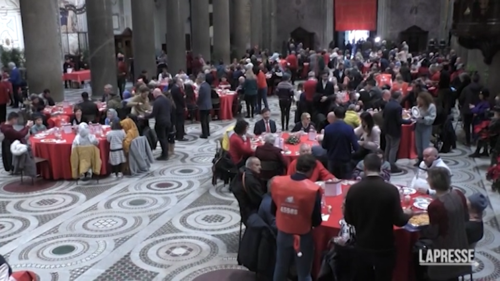 Come ogni anno si rinnova il tradizionale pranzo con i poveri promosso da Sant’Egidio nella chiesa di Santa Maria in Trastevere. Tra i volontari tante facce note come quella del giornalista televisivo Tiberio Timperi. ” Quest’anno vorrei dire è il Natale dei disarmati – dice Marco Impagliazzo, presidente della comunità di Sant’Egidio- In un mondo pieno di guerre nasce un bambino e come tutti i bambini nasce disarmato. Questo è un esempio per noi di far cadere tutto ciò che ci separa dagli altri per trovare uno spazio di fraternità. I problemi crescono perchè si aggravano le situazioni di povertò e di solitudine ma troviamo anche tanto aiuto qui, tanti volontari che sono al fianco dei più vulnerabili, aumentano le adesioni soprattutto tra i giovani”.