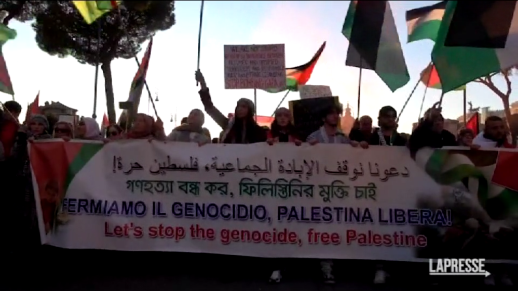 Circa 2mila persone in piazza per sostenere il popolo palestinese nel centro di Roma. A organizzare la manifestazione la comunità palestinese in Italia con alcune sigle di sinistra. Nel corteo presenti anche alcune bandiere sudafricane, in riferimento al ricorso alla Corte internazionale di giustizia presentato dallo stato africano nei confronti di Israele. La manifestazione partita dai Fori Imperiali ha attraversato il centro della Capitale in direzione Esquilino/Piazza Vittorio. “Il messaggio della piazza di oggi è quello di fermare il genocidio del popolo palestinese. Nient’altro. Noi vogliamo avere i nostri diritti e il mondo abbia i suoi doveri. Il nostro popolo sembra non esistere proprio. Vogliamo essere trattati come esseri umani” spiega Issa, che è nato a Betlemme ma vive in Italia da 43 anni. “È in atto un genocidio? 20mila civili uccisi di cui 10kila bambini. Più genocidio di così non so cosa ci sia” dice la giovane iraniana Fazane.