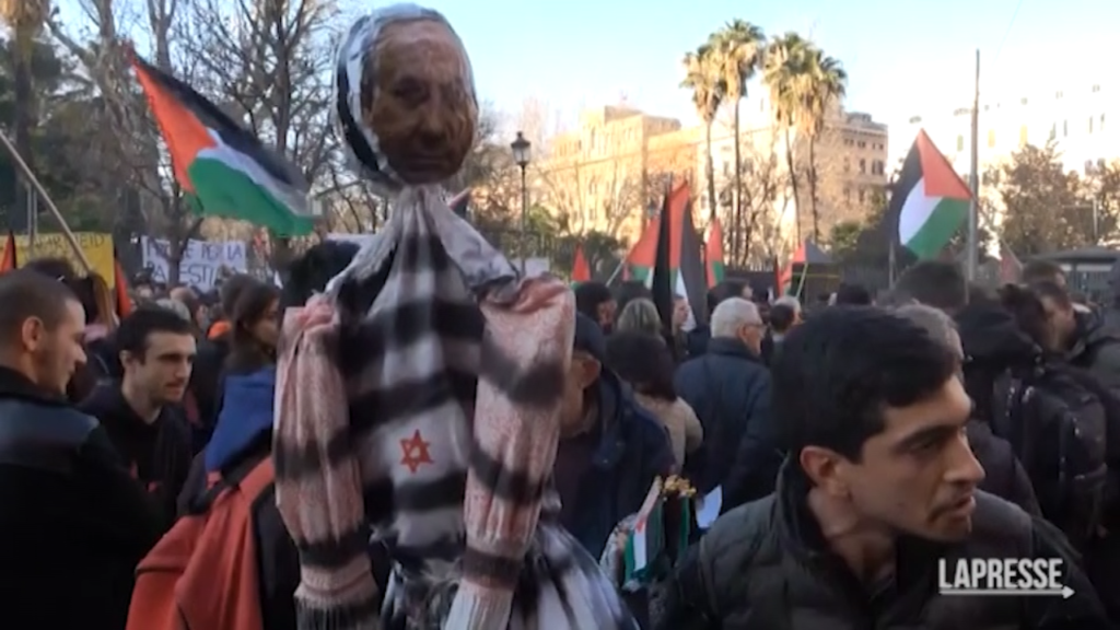 Circa mille i manifestanti pro-Palestina scesi in piazza Vittorio Emanuele a Roma. Gli attivisti si sono riuniti in assemblea alternando gli interventi, mentre un manichino con le fattezze del premier israeliano Benjamin Netanyahu vestito da deportato, con la stella di David e le mani incatenate e insanguinate, è stato esposto da un manifestante.