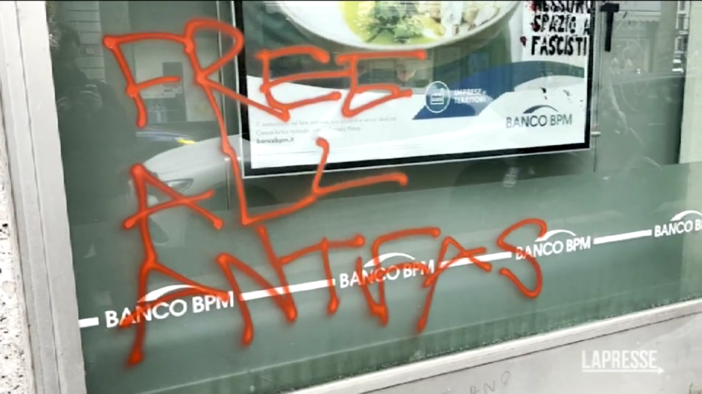 A denunciarlo l’europarlamentare Carlo Fidanza con il consigliere comunale Francesco Rocca. “È evidente che questi individui si sentano liberi di tenere in ostaggio e imbrattare con slogan anarcoidi la città, specialmente nella zona dei Navigli. L’augurio è che nella zona ci siano telecamere che permettano di individuare i responsabili di questi atti vandalici”, affermano in una nota i due esponenti di FdI. Le scritte “Ila e Gabri liberi” sono apparse sulle vetrine delle filiali di UniCredit e di Banco Bpm. Sulla vetrina di un negozio di telefonia è stato scritto con spray rosso “Free Gaza” e mentre su quella di un’agenzia immobiliare “10-100-1000 Acca Larentia”.