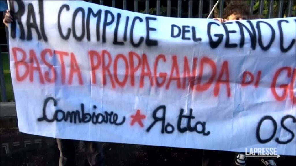 Flash mob di protesta delle associazioni di studenti Cambiare Rotta e Opposizione Studentesca Alternativa sotto la sede Rai a Roma in viale Mazzini. La manifestazione è stata convocata per protestare contro la lettura, da parte di Mara Venier a ‘Domenica In’ in diretta da Sanremo, di un comunicato in cui l’ad Rai Roberto Sergio afferma: “La mia solidarietà al popolo di Israele e alla Comunità Ebraica è sentita e convinta”.