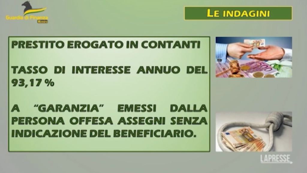 I Finanzieri del Comando Provinciale della Guardia di Finanza di Rimini hanno dato esecuzione ad un Decreto di sequestro preventivo del Giudice per le Indagini Preliminari del Tribunale di Rimini, su richiesta della locale Procura della Repubblica, a carico di un pluripregiudicato (già condannato per bancarotta fraudolenta, truffa, commercio di prodotti contraffatti, furto e ricettazione), per la ritenuta sussistenza dei reati di usura ed abusiva attività finanziaria. L’indagato avrebbe effettuato prestiti di denaro ad un imprenditore della provincia in forte difficoltà economica, applicando un tasso di interesse annuo del 93,17%, di gran lunga superiore a quelli previsti dalla Legge. Nel corso delle indagini sono stati sequestrati 12 assegni in bianco dell’importo complessivo di 79 mila euro e documentazione riportante la contabilità delle somme prestate, con il nominativo della presunta vittima ed i relativi piani di ammortamento.
