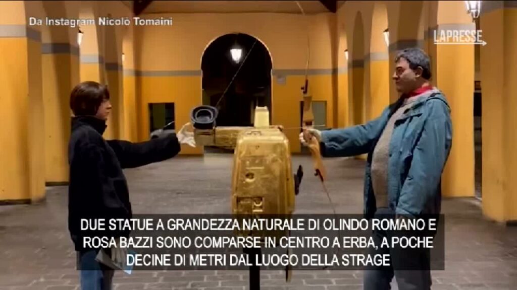 Due statue raffiguranti Olindo Romano e Rosa Bazzi a grandezza naturale sono apparse a Erba, in provincia di Como, vicino alla casa dove lo scorso 11 dicembre 2006 si consumò la nota strage. L’opera, realizzata dall’artista Nicolò Tomaini, è intitolata ‘The Lovers’. L’installazione arriva a due giorni dall’udienza sulla possibile revisione del processo che ha visto condannati Romano e Bazzi all’ergastolo. “Il processo, la ricostruzione che in esso è emersa delle vicende, la cronaca giudiziaria e la narrazione mediatica dei fatti non sono altro che alcuni dei passaggi attraverso cui nella percezione sociale si compie l’inversione del rapporto tra la realtà delle cose e la sua rappresentazione. Il falso prende il posto del vero, la copia quello dell’originale, mentre la vita, i sensi, le passioni, e più in generale tutto ciò che dovrebbe animare l’esistenza umana si azzerano, per lasciare il posto alla mortifera stretta di una rassegnata ubbidienza“, spiega in un post sui social l’artista Tomaini.