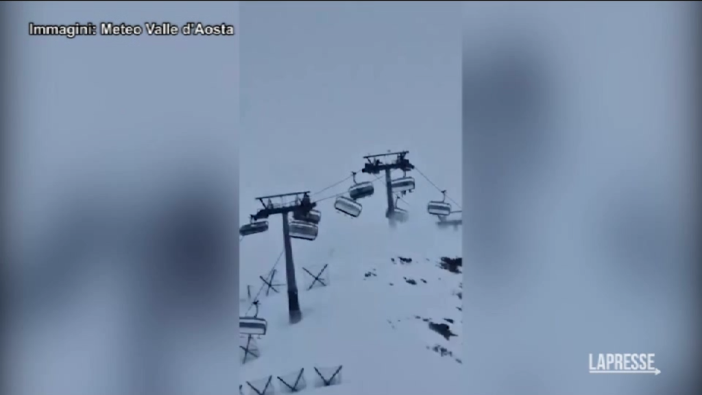 (LaPresse) Raffiche di vento a 110 chilometri orari hanno fatto ondeggiare spaventosamente la Seggiovia Cretaz a Breuil-Cervinia, frazione di Valtournenche, in Valle d’Aosta. In pochi minuti, il vento è passato da 20-30 chilometri orari alle ore 15 a raffiche fino a chilometri orari 15 minuti più tardi, imponendo il recupero degli sciatori e la rapida chiusura degli impianti per motivi di sicurezza.