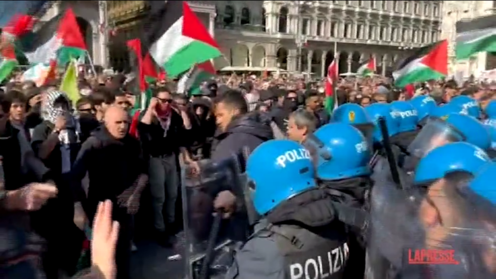 Secondo quanto riferisce la Questura di Milano, i reparti inquadrati delle forze dell’ordine sono intervenuti verso le ore 16.00 in piazza Duomo quando, al passaggio davanti il Mc Donald’s, la Brigata Ebraica è stata oggetto di robusta contestazione da parte di un gruppo di giovani nordafricani esagitati. Mentre alcuni ragazzi stranieri sventolavano le bandiere palestinesi a ridosso del servizio di accompagnamento dei City Angels, si è unito a loro un nutrito gruppo di giovani facinorosi, alcuni muniti anche di bastoni, che si è scagliato contro le persone che li dividevano dai manifestanti in corteo inveendo e tentando di colpire cameramen e fotografi che stavano riprendendo la scena. Due giovani sono stati subito fermati da personale della Polizia di Stato e accompagnati in Questura.Successivamente, verso le ore 16.30, all’interno di piazza Duomo, la porzione di giovani palestinesi attestatasi lì ben prima dell’inizio del corteo, ha sfondato la barriera con transenne predisposta a protezione del palco. Immediatamente intervenuti contingenti delle forze dell’ordine che hanno contenuto il gruppo che attualmente persiste nel tentativo di avvicinamento al palco.