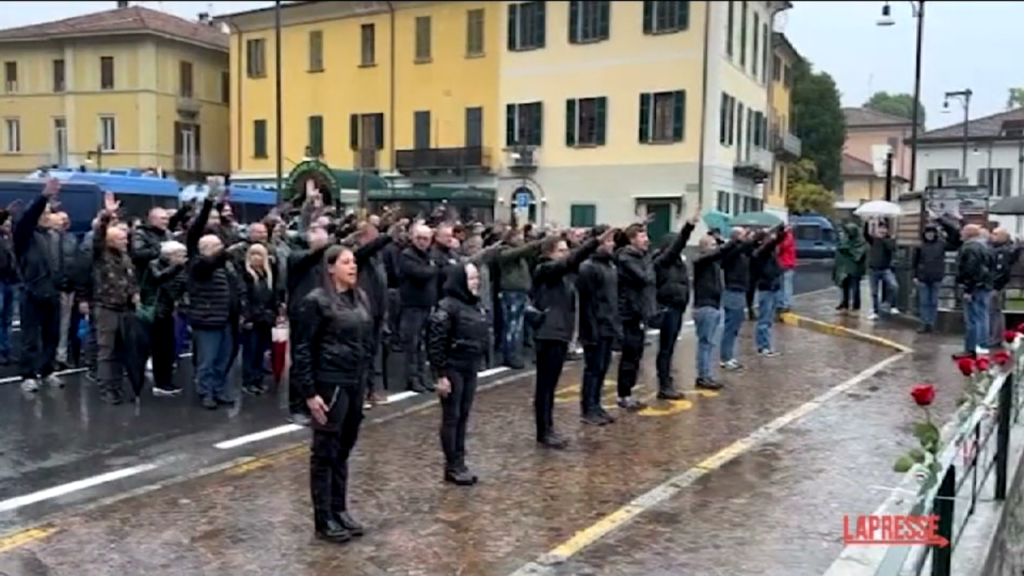Un’ottantina di militanti dell’estrema destra ha omaggiato con saluti romani, alla chiamata del “presente”, i 15 tra ministri e gerarchi fascisti che il 28 aprile 1945, nel tentativo di fuggire verso la Svizzera, vennero catturati insieme a Mussolini e fucilati dai partigiani a Dongo, in provincia di Como.