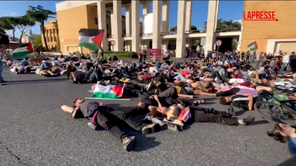 Si sono sdraiati a terra davanti all’ingresso dell’Università La Sapienza di Roma, in sottofondo il rumore assordante dell’esplosione delle bombe. “Per qualche minuto qui si è vissuto quello che ogni giorno vivono i palestinesi di Gaza” raccontano i manifestanti. Studenti e attivisti uniti alla comunità palestinese della Capitale si sono ritrovati anche oggi in piazza per un corteo di protesta contro “l’eccidio di Gaza“. Un presidio che si aggiunge alle tante mobilitazioni di queste settimane. Partito da piazzale Aldo Moro (proprio di fronte all’ingresso della città universitaria) il corteo si è poi snodato lungo le vie del quartiere San Lorenzo per poi terminare a piazza Vittorio. Tutto si è svolto senza tensioni con le forze dell’ordine.