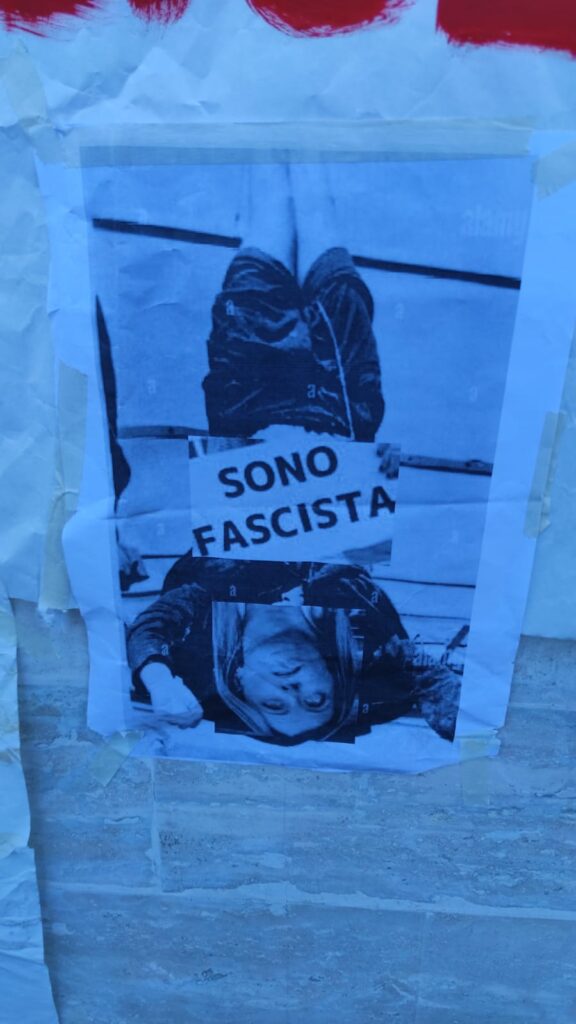 Un fotomontaggio del volto della presidente del Consiglio Giorgia Meloni incollato a un corpo appeso a testa in giù con la scritta ‘sono fascista’. È l’immagine affissa sui muri di largo Palmina Martinelli a Fasano, in provincia di Brindisi, dove si sono radunati i manifestanti del coordinamento ‘No G7’ che sfileranno in corteo nel comune dove si trova Borgo Egnazia, sede dei lavori del G7. Sul muro anche le foto in bianco e nero dei partecipanti al summit – da Emmanuel Macron al presidente turco Erdogan, all’immagine di Rishi Sunak, primo ministro del Regno Unito, e a quella di Narendra Modi, primo ministro dell’India – con un rivolo di sangue colorato con il pennarello rosso ai lati della bocca.