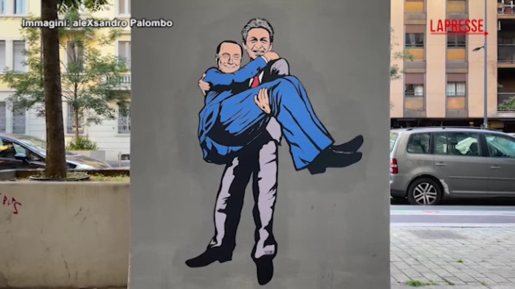 A un anno dalla morte di Silvio Berlusconi e a quarant’anni da quella di Enrico Berlinguer, a Milano un’opera d’arte pubblica carica di significato li unisce e li celebra. In Via Volturno, davanti alla casa d’infanzia del Cavaliere e di fronte alla sede storica del PCI milanese, è spuntato un murale dell’artista aleXsandro Palombo dal titolo “Insieme“, che ritrae il fondatore di Forza Italia in braccio allo storico leader del Partito Comunista Italiano come nel leggendario scatto in cui l’attore Roberto Benigni prese in braccio un Berlinguer sorridente nel famoso incontro del 16 giugno 1983, quando il PCI organizzò una manifestazione al Pincio, il celebre colle di Roma con il suo spettacolare affaccio panoramico su Piazza del Popolo. Entrambi i leader appaiono uniti, sereni e sorridenti, Enrico Berlinguer in abito grigio e cravatta rossa, Silvio Berlusconi con il suo immancabile doppiopetto blu e scarpa Derby nera.