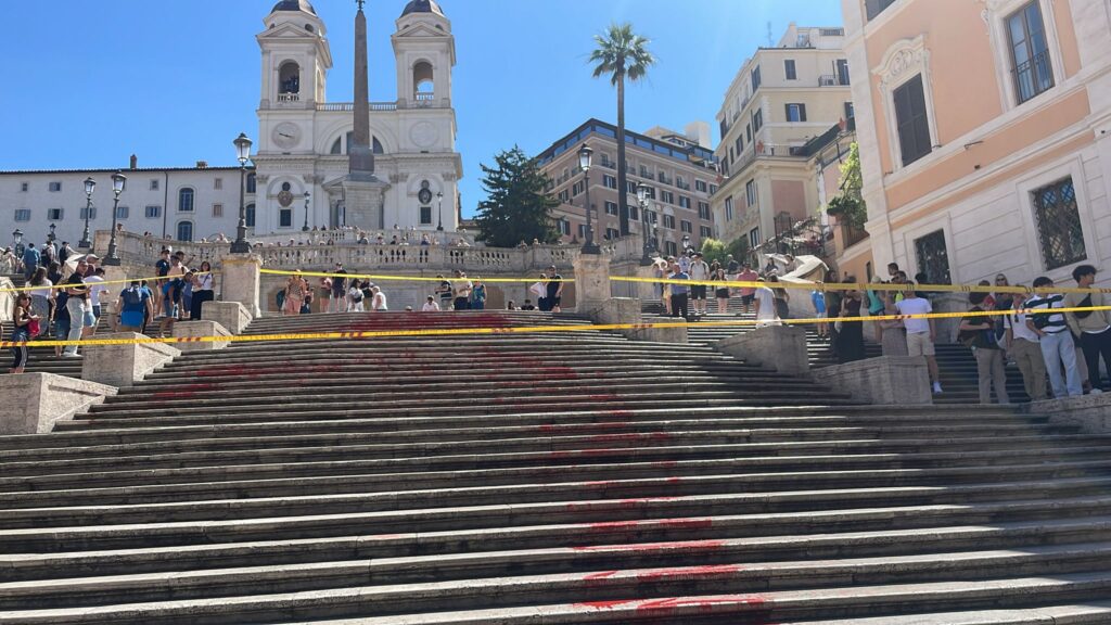 Gli attivisti che hanno gettato questa mattina vernice rossa sulle scale di Trinità de Monti a Roma sono sei ragazzi appartenenti al gruppo ‘Bruciamo tutto’ che hanno esposto uno striscione e gettato dei volantini con i nomi delle donne vittime di femminicidio. I manifestanti sono stati subito portati via e la scalinata è stata chiusa al pubblico.