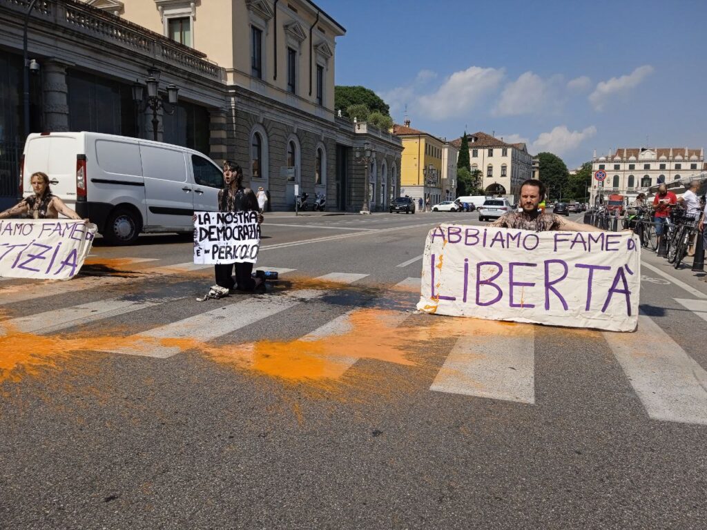 Questa mattina intorno alle 11 tre persone aderenti alla campagna ‘Fondo Riparazione’ di Ultima Generazione hanno versato della vernice sulla strada adiacente a Prato della Valle, dove si tiene il consueto mercato del sabato. Dopo essersi ricoperti con carbone vegetale, gli attivisti si sono seduti sulle strisce pedonali con degli striscioni, spiegando il motivo dell’azione di protesta, ovvero l’inasprimento della repressione per le proteste pacifiche in Italia, e anche nella dimensione cittadina di Padova. Dopo poco sono arrivate le forze dell’ordine che hanno portato via le persone che hanno partecipato all’azione.