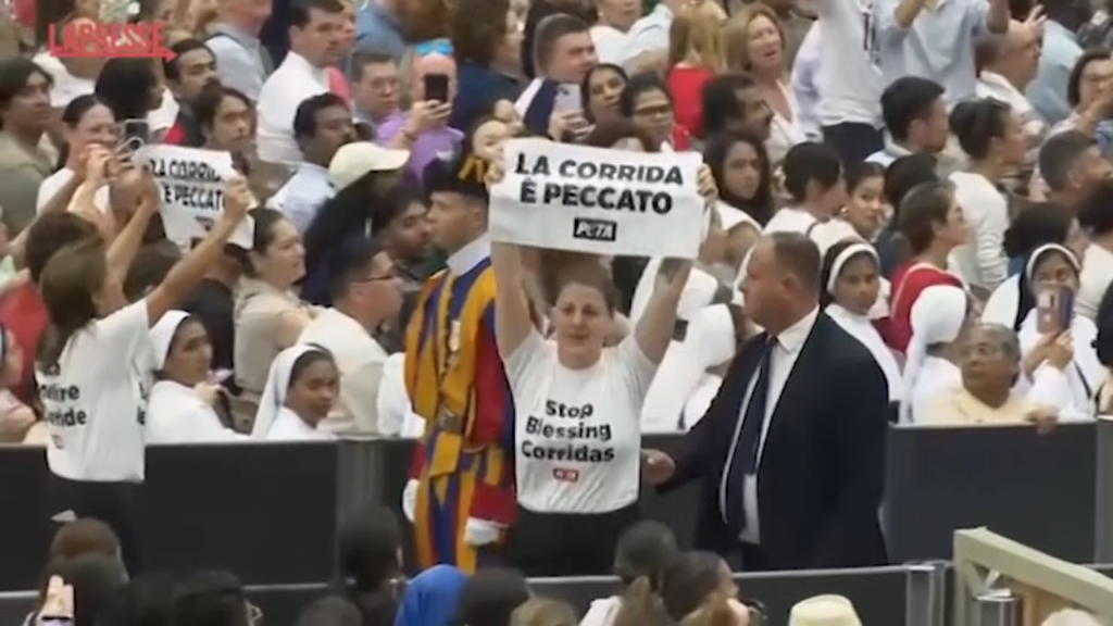L’udienza generale di stamattina di Papa Francesco è stata brevemente interrotta da due manifestanti di Peta, associazione animalista, che chiedevano la fine della corrida.